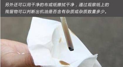 将机油倒在拇指与食指之间捻磨,手感应该有润滑性、无磨屑、无摩擦,如果感到手指之间有砂粒之类较大摩擦感,则表明机油内有铁屑、油泥和杂质。