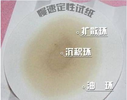 四级:只有中心沉积环和油环,没有扩散环,沉积环乌黑沉积物密而厚稠,不易干燥,油环成深黄色和浅褐色,油质已经氧化变质