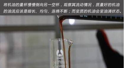 将装有机油的量杯慢慢倒向另一空杯,观察其流动情况,质量好的机油的油流应该是细长、均匀、连绵不断;而变质的机油会呈油滴状态。