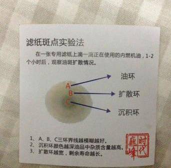 取出机油尺,在慢速定性试纸滴一滴机油尺上的机油,把试纸水平放置,静待24小时。发现经过24小时静置试纸上会出现下面提到的三个重要的环状区域。
